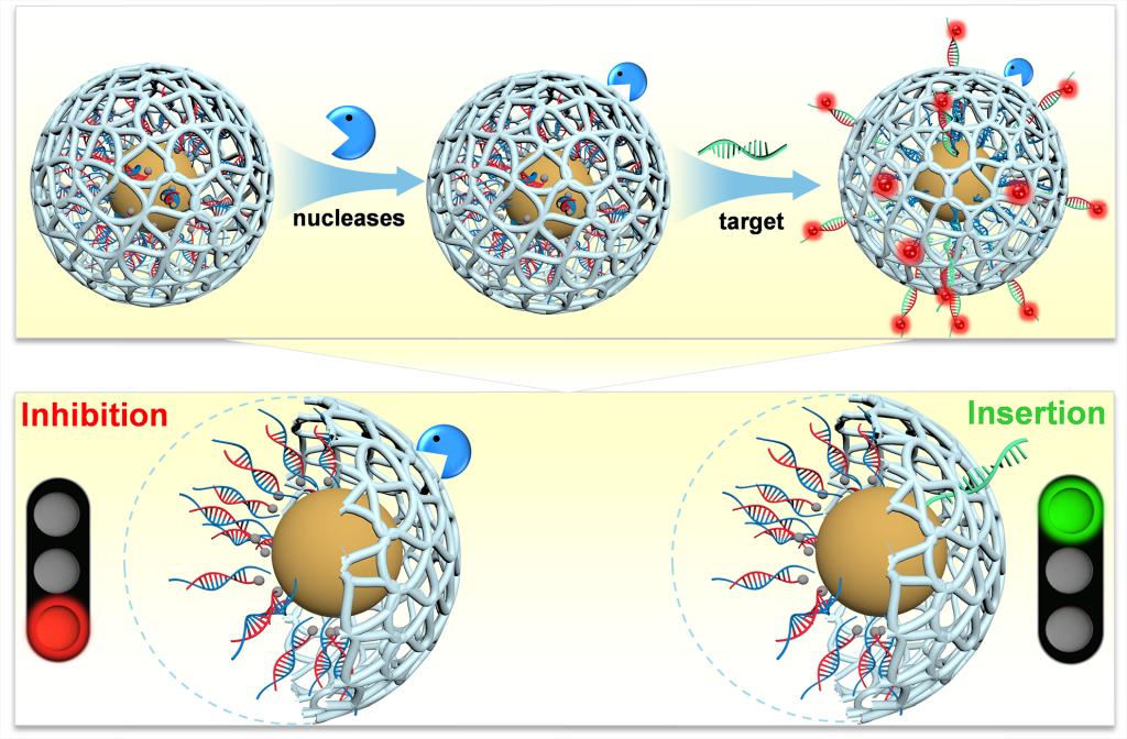 核酸纳米探针由于纳米保护效应,具备一定的抗酶切能力,但是在高浓度或长时间核酸酶作用下,暴露在外侧的核酸“外衣”亦受到非特异性攻击破坏。针对该问题,研究团队发展了纳米笼保护策略,通过物理屏蔽作用,将核酸纳米探针保护在纳米笼内,防止外侧大分子核酸酶的攻击,结合Pt/PolyA介导合力作用稳定修饰核酸探针策略,实现了抗酶切和抗硫醇的“双抗”功能及传感信号的准确获取,相关成果以“Physically Masked Nanoflares for Accurate Biological Applications by Blocking Nucleases”为题发表在国际化学权威杂志Angew. Chem. Int. Ed.(DOI: 10.1002/anie.202513763),该论文第一作者为周怡波副教授,通讯作者为卿志和教授,本研究实验工作由研究生王玉平(2021级)、胥傲霜(2023级)共同完成,得到了国家自然科学基金、湖南省自然科学基金、长沙市科技计划项目等项目的支持。