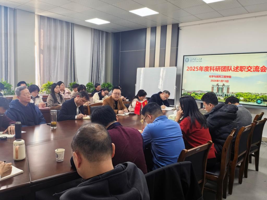 为全面总结过去一年科研工作进展,加强各团队间的交流互鉴与协同创新,2026年1月13日,化学与医药工程学院于工科三号楼B-446举行了2025年度科研团队述职交流会。学院院长张跃飞、学院各科研团队负责人、骨干教师及青年科研人员等40余人参加了会议,会议由学院党委书记宋刘斌主持。