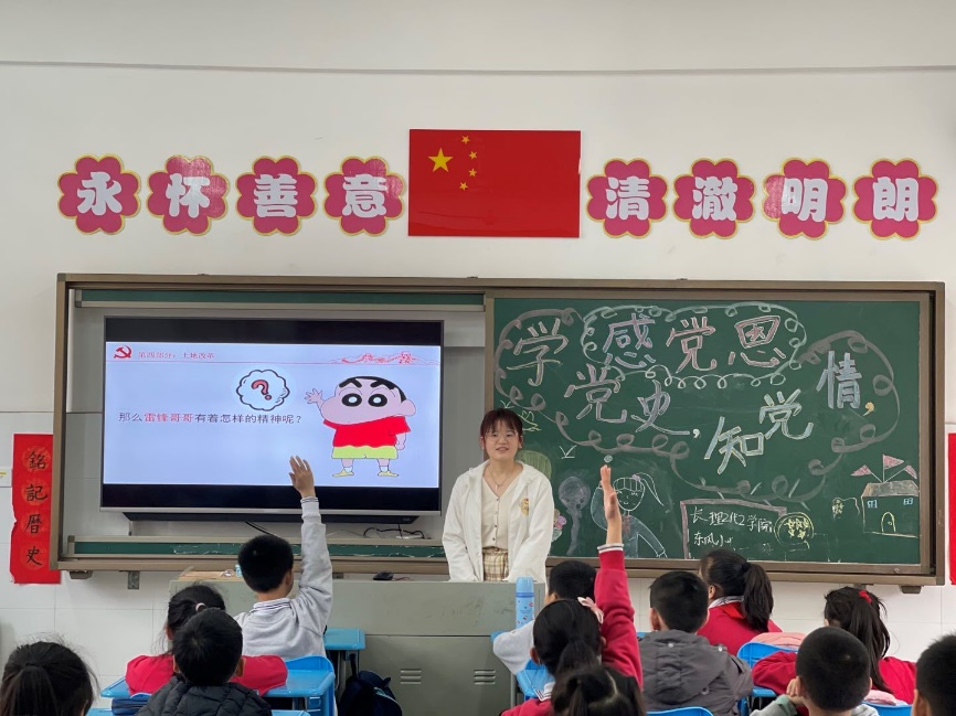 化学与食品工程学院食品本科生党支部宣讲员贺瑶通过小视频、动画党史故事等贴近小学生实际的生动活泼故事情节,带领小朋友回顾了中国共产党的诞生、红军长征、新中国成立三个方面的党史知识,用寓教于乐的方式展示出中国共产党的艰苦卓绝的奋斗之路。在播放视频《丰碑》后,她以深入浅出的方式引导大家理解长征精神,她指出“视频中军需处长将御寒军衣给了小战士,自己却永远留在了雪山上,在长征途中还有许许多多像处长的红军战士,他们为了革命的胜利,无私奉献,艰苦奋斗。长征过程展现出了中华民族的百折不挠和自强不息,而这种吃苦耐劳、勇往直前的精神也被称为长征精神。”