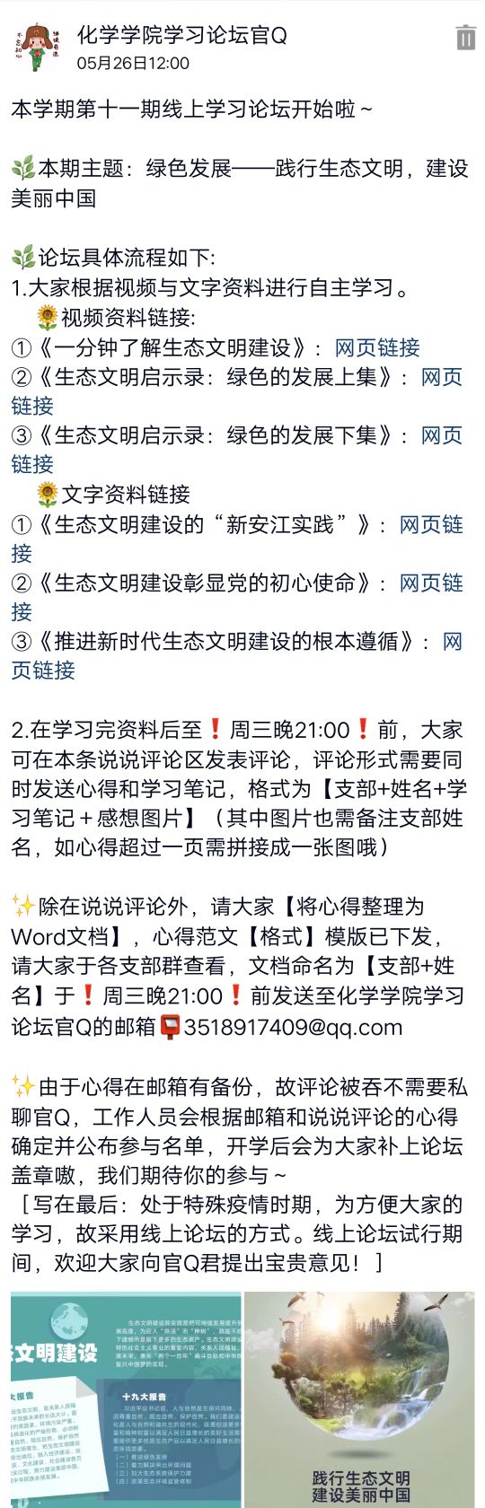 5月26日至5月27日,化学学院学生党总支通过线上发布资料的方式,举办第十一期线上学习论坛。本期主题为“绿色发展——践行生态文明,建设美丽中国”,共有来自8个支部的115名同志参加。