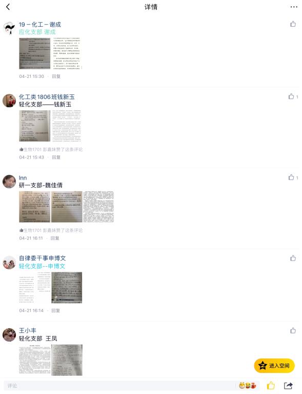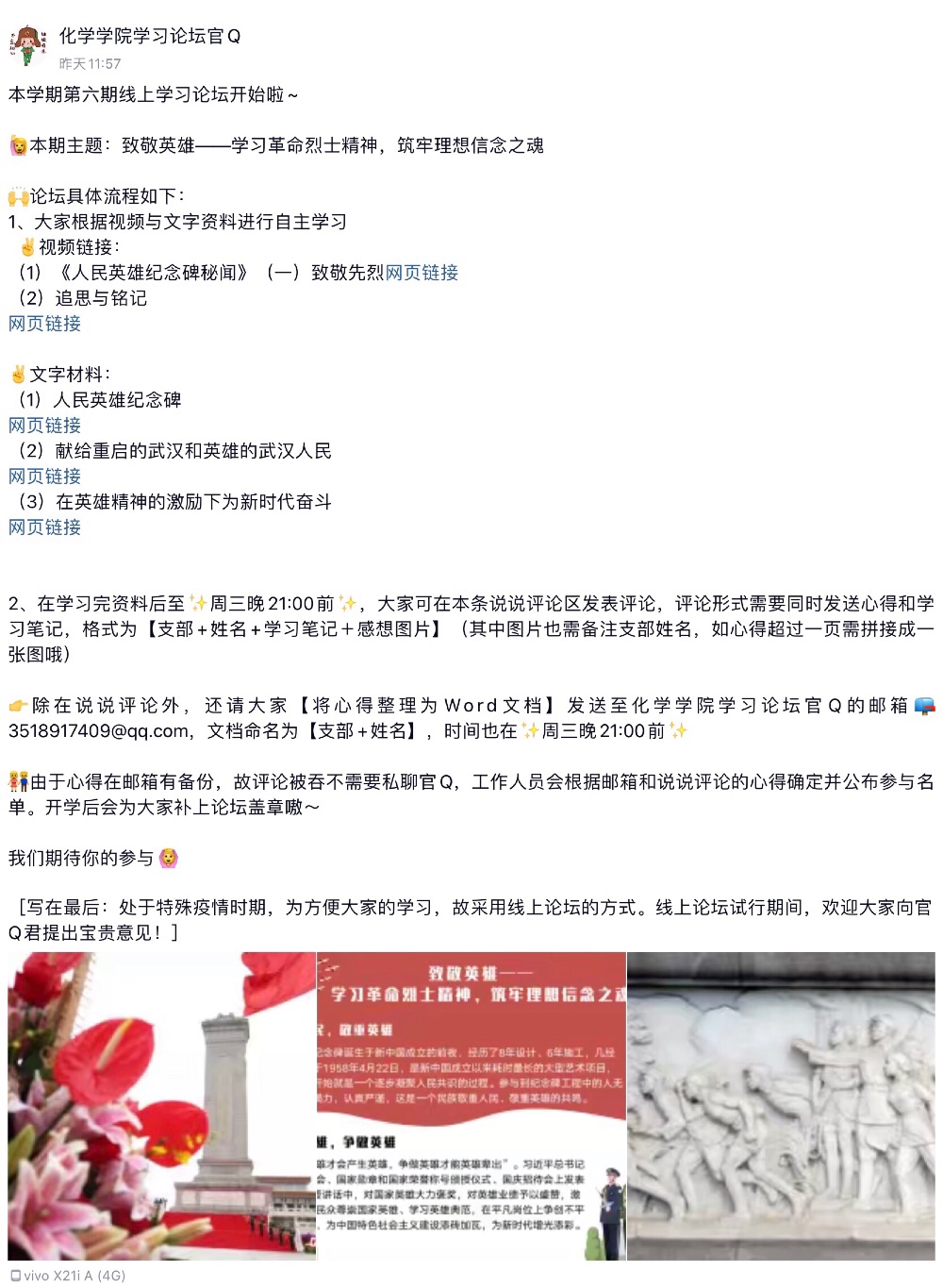 4月21日至4月23日,化学学院学生党总支通过线上发布资料的方式,举办第六期线上学习论坛。本期主题为“致敬英雄——学习革命烈士精神,筑牢理想信念之魂”,共有来自八个支部的150余名同志参加。