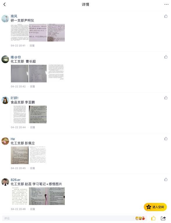 围绕人民英雄纪念碑之致敬先烈,追思与铭记为共和国的成立、建设和改革事业作出奉献和牺牲的先烈们等视频资料进行学习。资料生动阐述了人民英雄纪念碑创作过程的艰难,表达了全国各族人民敬重人民英雄的共情,并在英雄精神的激励下争做新时代英雄,为中国特色社会主义建设添砖加瓦。深入学习后大家进行了热烈的线上讨论交流。食品支部贺璇兮认为,“英雄应该是忠诚的,他们对党和人民的伟大事业矢志不渝,坚守住自己的初心,为人民谋幸福,为民族谋复兴。英雄应该是执着的,他们敢啃别人不敢啃的硬骨头,愿意几十年如一日地埋头苦干,对事业的坚守无怨无悔。”化工支部彭佩立表示,“死亡不是生命的终点,遗忘才是永恒的消亡,而人民英雄纪念碑便是党和国家对人民英雄的恭肃与谦敬,是对人民英雄永恒的追思与铭记。”环工支部朱映铭谈到,“英雄见于伟大品格,伟大成于平凡事业,伟业需要接续奋斗。作为新时代青年,我们更应该继承革命先辈的光荣传统,学习他们的无畏牺牲和奉献精神,勇担青年一代的历史重任,为实现中华民族伟大复兴的中国梦不懈奋斗”。