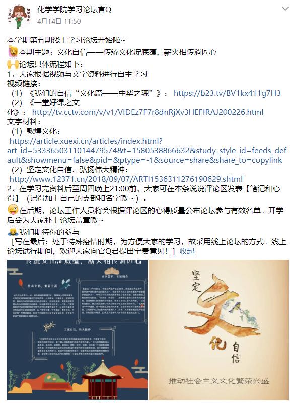 4月14日至4月17日,化学学院学生党总支举办第五期线上学习论坛。本期主题为“文化自信——传统文化淀底蕴,薪火相传淌匠心”,共有来自九个支部的176名同志参加。