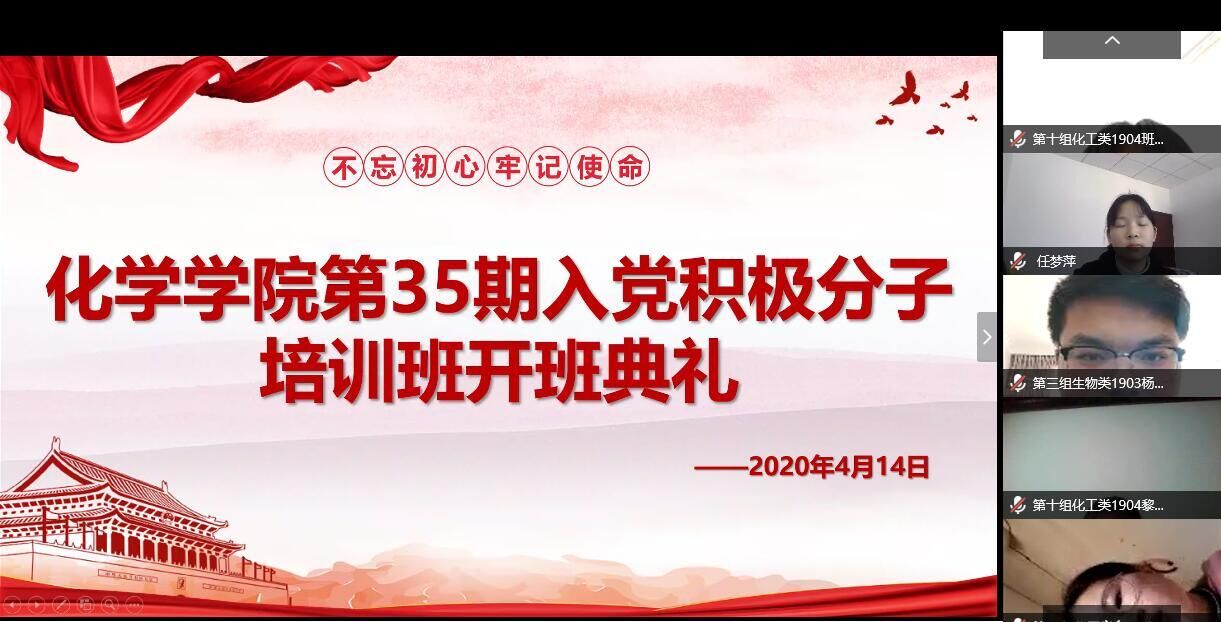 4月14日下午,化学学院第三十五期入党积极分子培训班开班典礼在腾讯会议上成功举行。党建辅导员刘文成,培训班负责人及120名积极分子参加此次开班典礼。