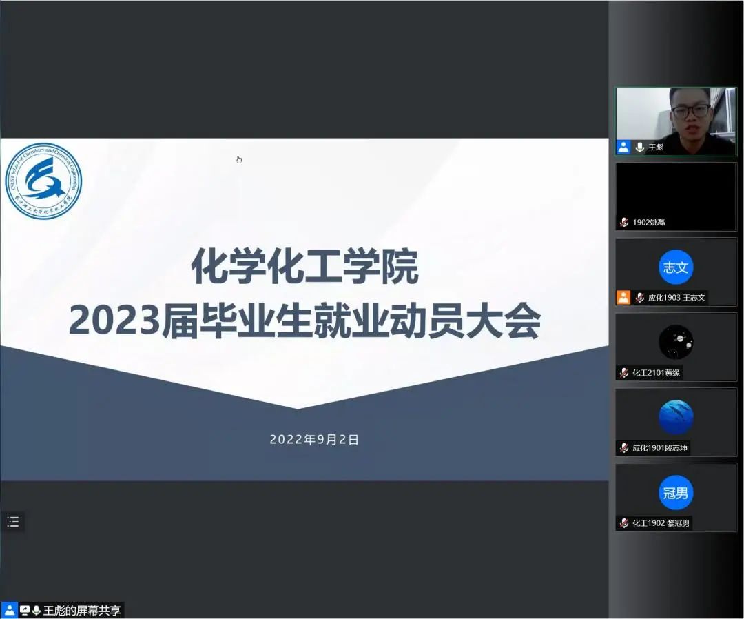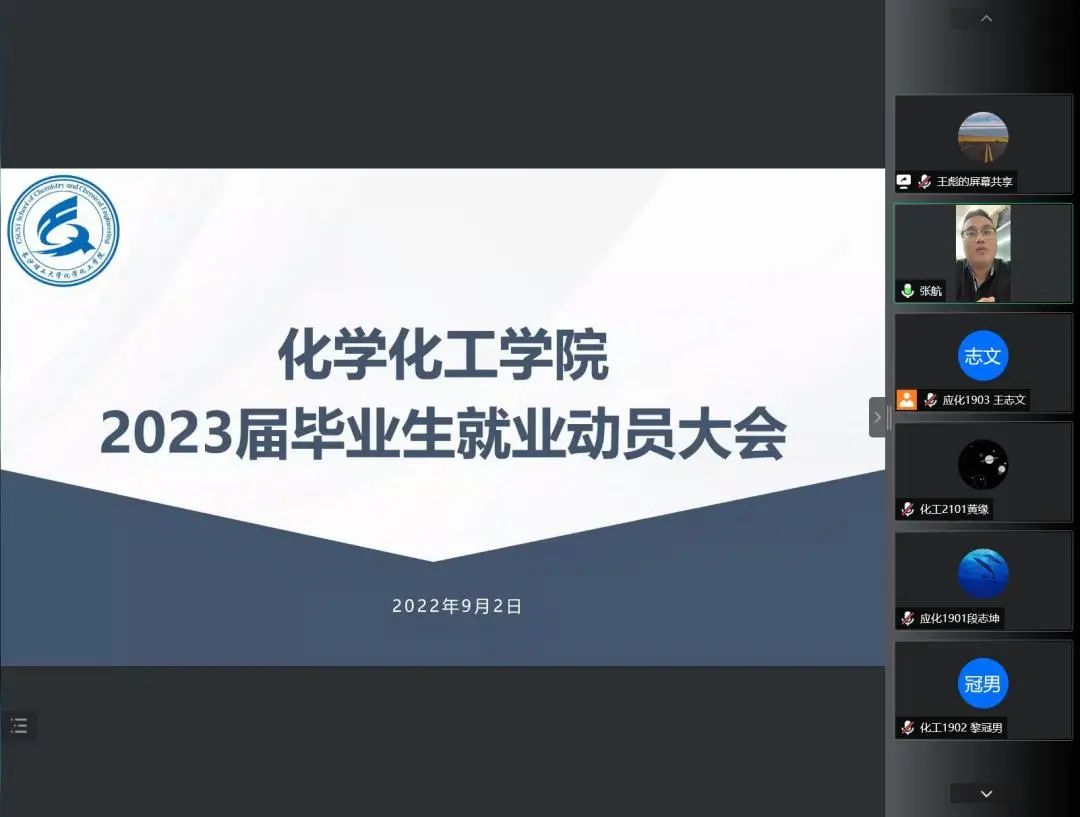 9月2日19:00,永利集团88304官网化学化工学院2023届毕业生就业动员大会以腾讯会议的形式召开。年级辅导员王彪主持会议,学院党委副书记陶双、就业专干张航出席,2023届毕业生参加。