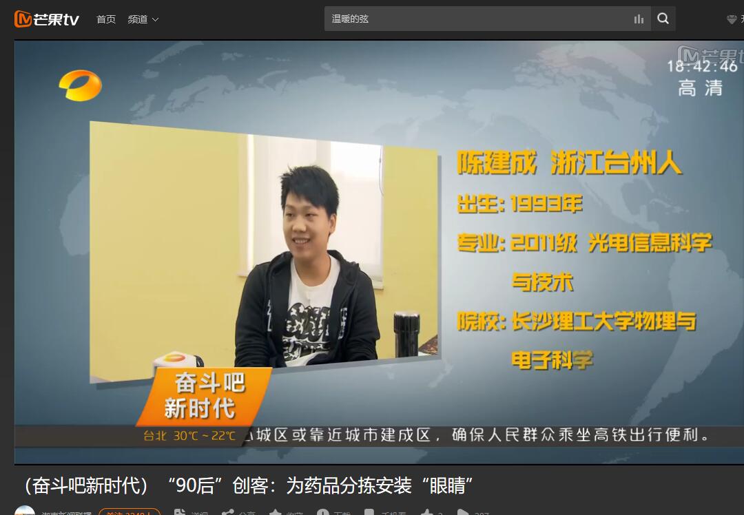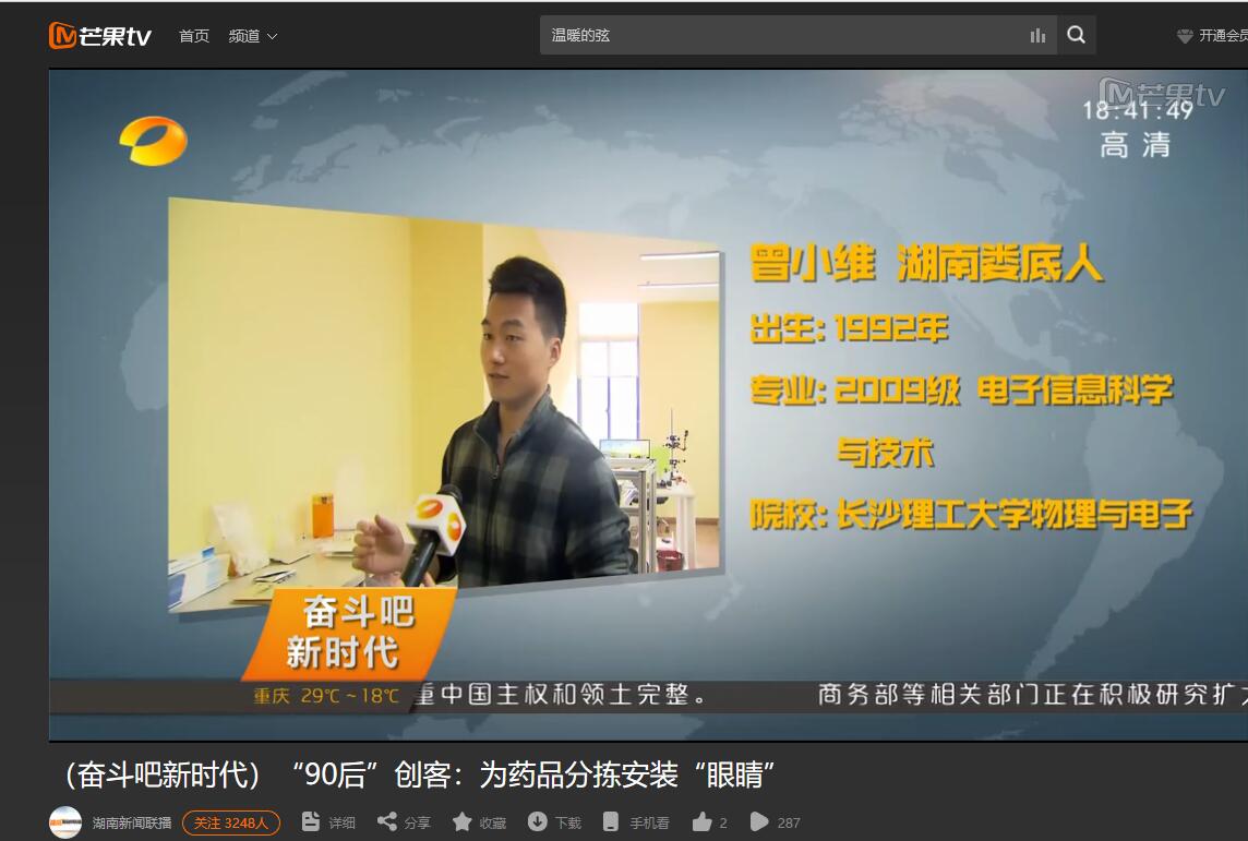 湖南卫视2018年5月8日新闻联播,报道了永利集团88304官网物理与电子科学学院3名毕业生的创新创业故事,曾小维、刘浪和陈建成分别是永利集团88304官网13、14、15届毕业生。大学期间,他们都是学院创新团队成员,曾获全国大学生电子设计大赛一等奖。2016年,开始借助机器视觉技术开发出计数和检验系统,能高精度、高速度完成散装产品(药片或胶囊)的外观合格检测和产品计数,技术填补了国内市场空白。