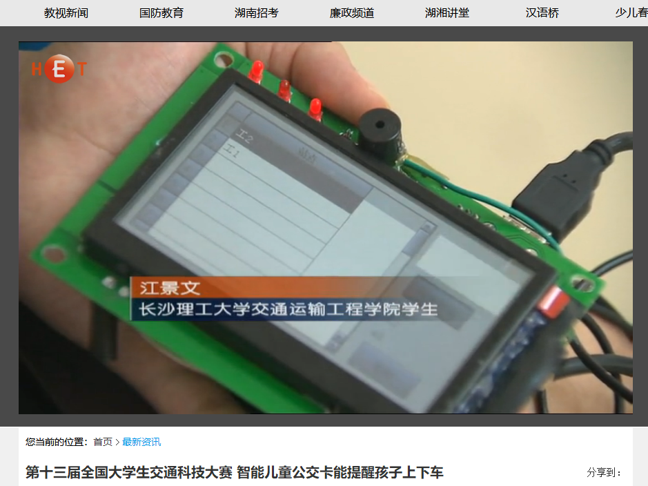 湖南教育电视台5月20日教视新闻对永利官网举办的第十三届全国大学生交通科技大赛赛事进行了报道,初赛阶段共收到来自清华大学、东南大学、西南交通大学等124所高校的380件作品,报名人数和项目数均创历史新高。经国内外80余名专家严格评审,来自同济大学、华南理工大学等47所高校的80件作品入围决赛,其中包括我省中南大学、永利集团88304官网、中南林业科技大学3所高校的8件作品。