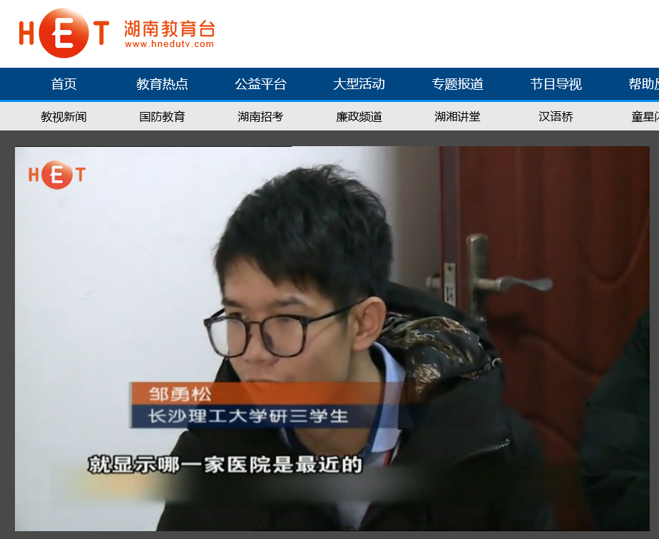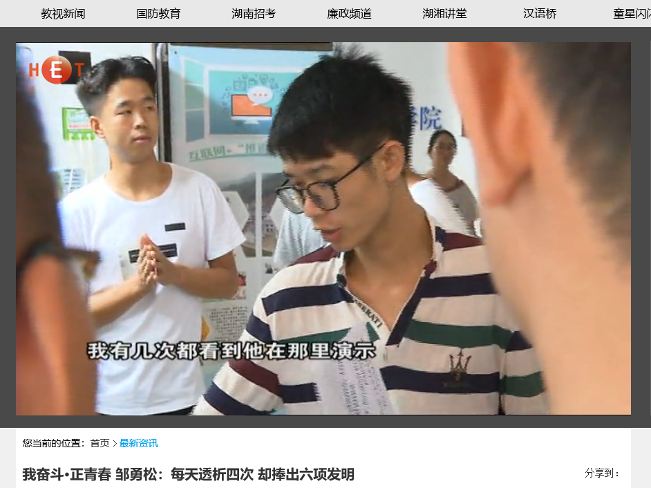 6月9日湖南教育电视台首页最新资讯,以《我奋斗 正青春 邹勇松:每天透析四次,却捧出六项发明》为题对永利官网计算机与通信工程学院15级研究生邹勇松进行了报道。