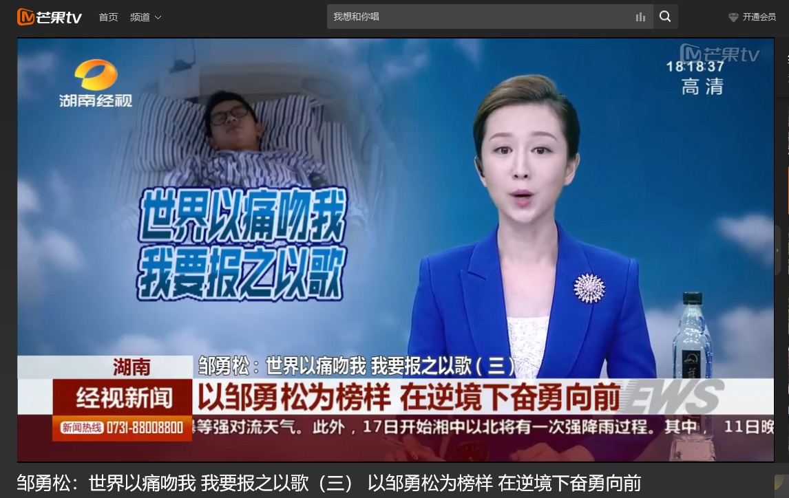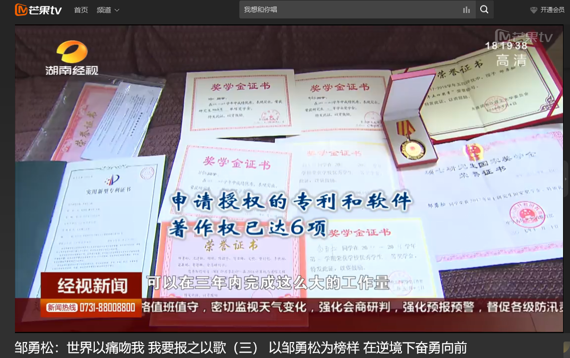 湖南经视 6月11日经视新闻,以《邹勇松:世界以痛吻我 我要报之以歌(三) 以邹勇松为榜样 在逆境下奋勇向前》为题对永利官网计算机与通信工程学院15级研究生邹勇松进行了报道。