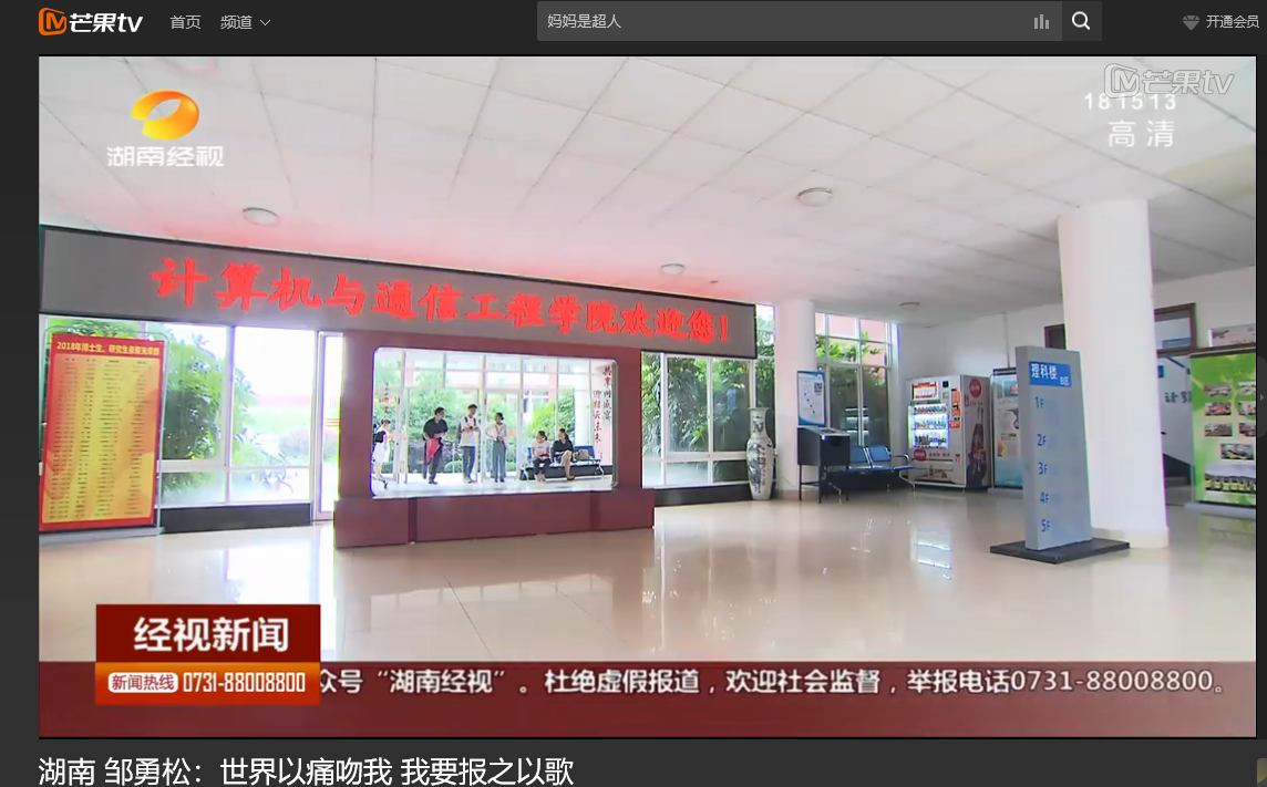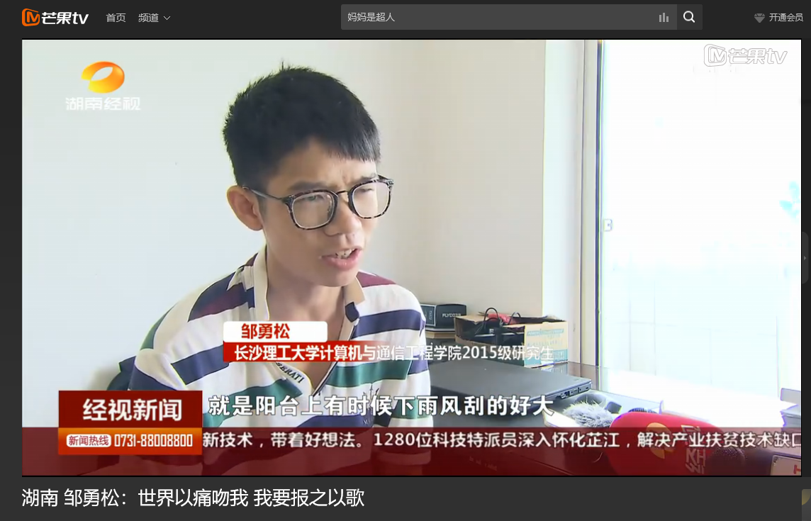 湖南经视6月9日经视新闻,以《邹勇松:世界以痛吻我 我要报之以歌》为题对永利官网计算机与通信工程学院15级研究生邹勇松进行了报道。