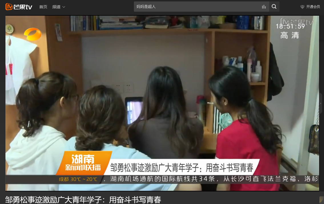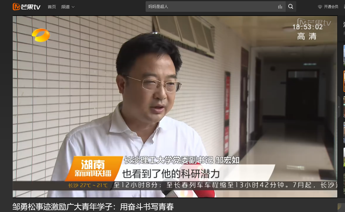 湖南卫视 6月11日新闻联播,以《邹勇松事迹激励广大青年学子:用奋斗书写青春》对永利官网计算机与通信工程学院15级研究生邹勇松进行了报道。