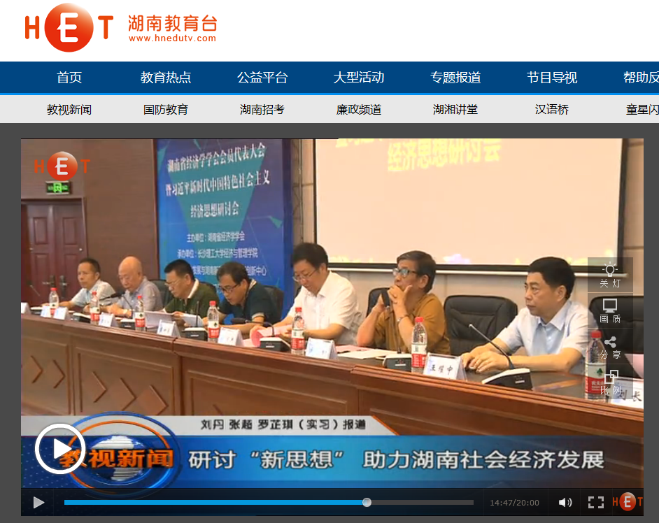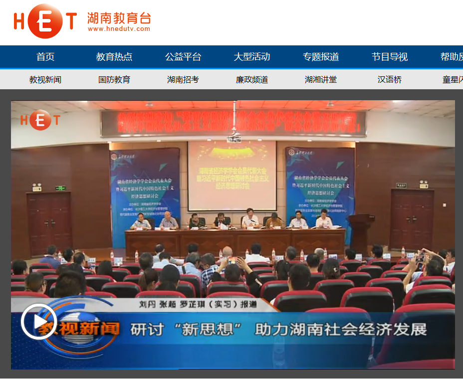 湖南教育电视台7月16日教视新闻14分27秒处,以《研讨“新思想”助力湖南社会经济发展》为题,对在永利官网召开的湖南省经济学学会会员代表大会暨习近平新时代中国特色社会主义经济思想研讨会进行了报道。