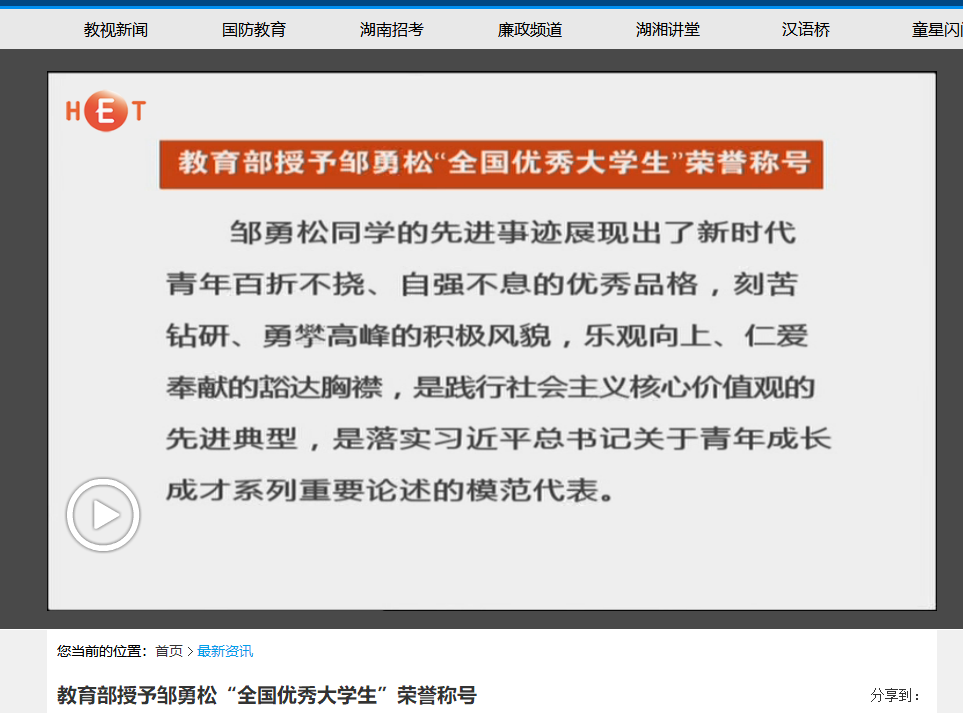 湖南教育电视台7月20日教视新闻中,以《教育部授予邹勇松“全国优秀大学生”荣誉称号》为题对邹勇松进行了跟踪报道。