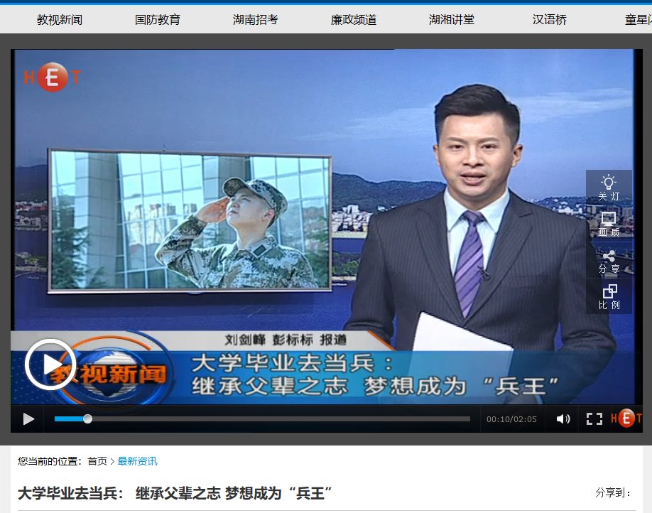 湖南教育电视台7月23日教视新闻,以《大学毕业去当兵: 继承父辈之志 梦想成为“兵王”》为题对永利官网永利集团88304官网土木工程学院2018届毕业生江紫轩进行了报道。毕业前,他放弃了国企稳定的工作,填写了入伍申请,即将投身军营。