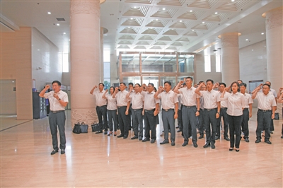 2019年9月5日,校党委书记付宏渊带领校党委班子成员、党群部门主要负责人和各二级党组织书记赴湖南省党史陈列馆参观学习,开展革命传统教育活动。图为党员干部重温入党誓词。