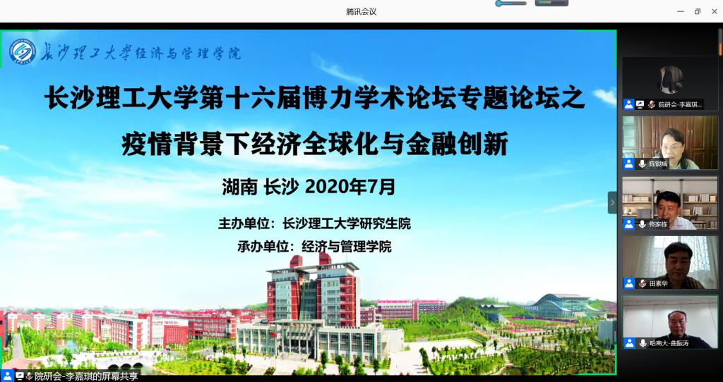 7月5日上午,第十六届研究生博力学术论坛正式开幕,本次论坛设置了专题论坛 ——“疫情背景下经济全球化与金融创新”,由经济与管理学院与外国语学院联合承办,采用腾讯会议方式在线举行。副校长谈传生,研究生院、人文社科处,经管学院、外语学院等相关部门和学院领导出席开幕式。本次论坛还吸引了来自复旦大学、中南财经政法大学、河北经贸大学等高校以及永利官网经管、外语、艺术、化学等学院教师、研究生近300人在线参加。论坛开幕式由经管学院院长陈银娥教授主持。