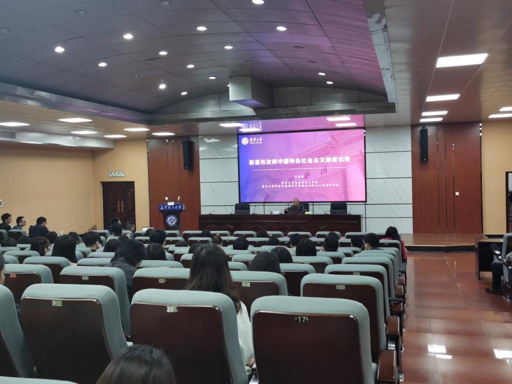 10月19日上午,清华大学的习近平新时代中国特色社会主义思想研究院副院长、博士生导师肖贵清教授应邀在永利官网金盆岭校区4教1楼报告厅,主讲题名为《彰显和发挥中国特色社会主义制度优势》的讲座。马克思主义学院副院长张明海,谢文成副教授、陈方芳博士、王威峰博士等专业老师,以及部分辅导员老师、校机关部分人员,学院在校二三年级研究生及2020级马克思主义理论专业全体研究生参加,讲座由张明海教授主持。