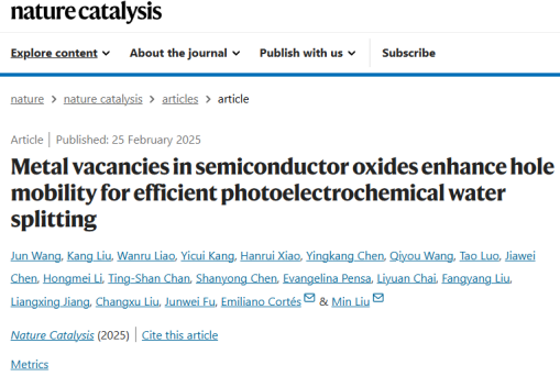 论文信息:Wang, J., Liu, K., Liao, W. et al. Metal vacancies in semiconductor oxides enhance hole mobility for efficient photoelectrochemical water splitting. Nat. Catal. (2025).