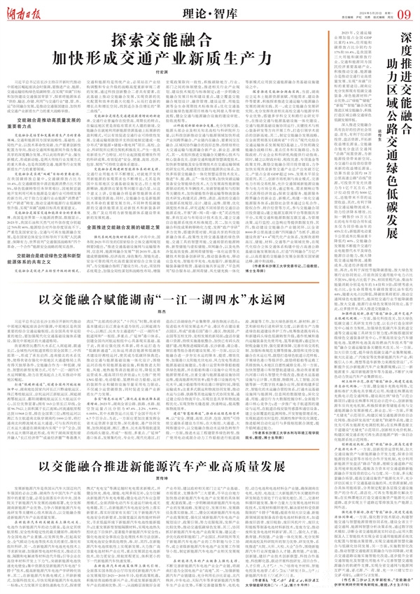 交通是兴国之器、强国之基,能源是立国之本、安邦之道。交通运输和能源行业在国家发展全局中具有基础性、先导性、战略性作用。深入推进交通运输与能源融合发展,是服务国家重大战略、支撑经济社会平稳发展的重要举措,是保障国家能源安全、构建大安全格局的现实需要,也是加快发展新质生产力,扎实推进高质量发展的必由之路。5月20日,《湖南日报》理论智库版整版刊发永利官网4位专家学者的理论文章,从《探索交能融合 加快形成交通产业新质生产力》《深度推进交能融合 助力区域公路交通绿色低碳发展》《以交能融合赋能湖南“一江一湖四水”水运网》《以交能融合推进新能源汽车产业高质量发展》为推动交能融合发展集智献策。