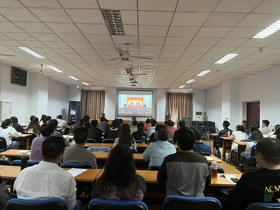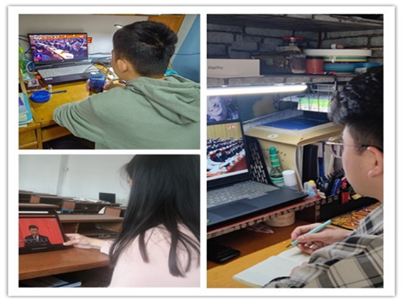 在2教201室,全体教职工精神饱满、端坐静听。在2教101室,学生党员代表齐聚一堂,认真观看。当听到一个个振奋人心的消息和举世瞩目的成就时,大家都情不自禁地鼓掌。在教室,在宿舍,在食堂,在图书馆,处处都有城南学子收看大会直播的身影。
