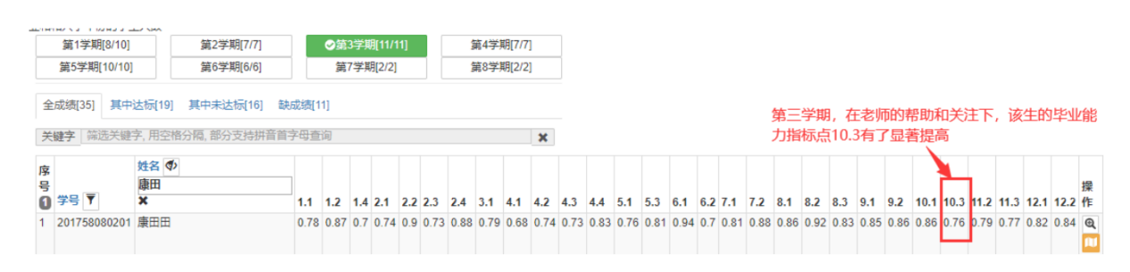 为了督促学生大学四年能达到毕业能力要求,为此针对本专业在校学生,借助学院开发的计易通系统对大学四年每个学期的能力达成情况进行跟踪和评估。下面以 2017 级学生康田田(学号:201758080201)同学为例来说明毕业能力形成性评价过程的评价和跟踪情况。根据课程目标与毕业要求的支撑关系,教师在每学期课程教学完成后,会收集整理本课程目标达成的评价数据,数据通过审核后,由授课老师把数据输入“计易通-工程认证”系统中,评价学生课程目标达成情况。这样系统就可以统计出学生该学期的所有课程目标能力达成评价值,根据能力达成标准,如果计算出该学生的某毕业要求达成评价值有小于预设值的情况,则把该生设置为预警学生,同时把该毕业要求能力点设置成高亮度。图8给出了该生第 2 学期的达成评价数据。从图中可以看出该生毕业要求指标点10.3 小于预设值 0.66,表明该能力这学期没有达到毕业要求,需要在后续的学期中重点关注该同学这个毕业要求能力指标点的培养。