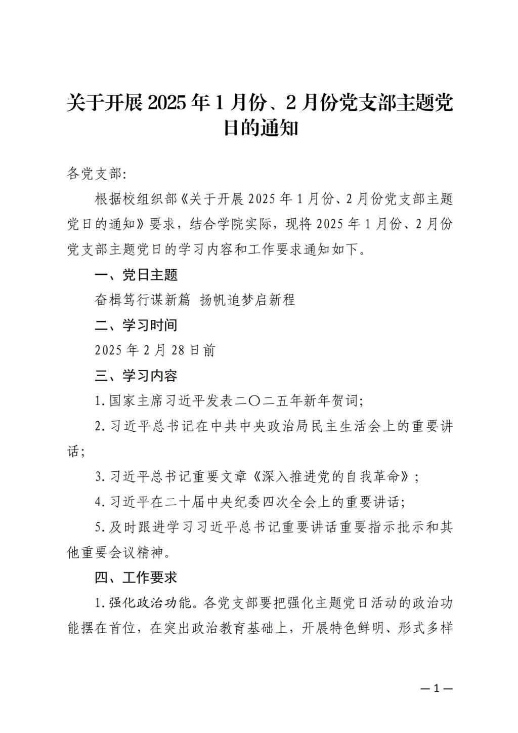 关于开展2025年1月份、2月份党支部主题党日的通知