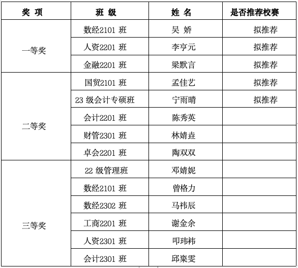 根据《教育部关于举办首届全国大学生职业规划大赛的通知》(教学函〔2023〕1 号)和《“ 中交杯 ”长沙理工大学第十一届职业生涯 规划大赛暨首届全国大学生职业规划大赛校级选拔赛的通知》相关工作要求,通过线下答辩、学院材料审核、学院评选指标设立等方面综 合考虑,现将永利集团88304官网第十一届职业生涯规划大赛经管学院选拔赛拟推荐校赛名单和获奖名单公示如下: