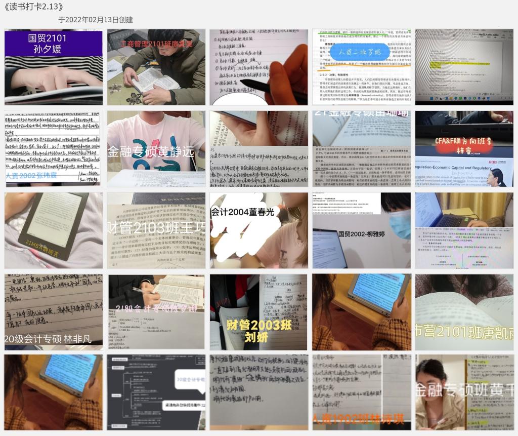 寒假离校不离书,从放假之日起,经管学院建立“商科经典读书”社群,方便同学们以群相册每日上传阅读笔记的方式进行读书打卡。尽管在寒假期间,群里浓厚的学习气氛不减,辅导员老师和同学们互相提醒、交流所看书目、分享读书心得,过年期间也未间断。直到发稿日,还有学生陆续进群,在学院传递着爱读书、读好书的良好阅读风气。周路路老师在连续25天的“云陪伴”中发现,学生们放假在家难免“躺平”,有打卡群的持续督促激励,不知不觉就做到了坚持读书,有效拓展了阅读能力和专业知识面。
