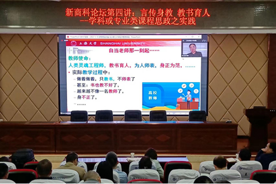 叶教授以“言传身教  教书育人”为题,围绕为何要课程思政、怎样做课程思政、课程思政之初心三个方面,从课程思政的缘起,到作为一个教师如何做到真正的课程思政;从教育先辈钱伟长的事迹,到叶志明教授传承坚守教书育人初心;从科学精神、家国情怀,到课程思政的教材及课程思政的本身就是教师的初心。两个半小时的讲座,为经管学院的老师们呈现了一个极具正念正信的教育家几十年不辍耕耘于本科教学的真实故事,既醍醐灌顶,又催人奋发;既引人入胜,又直入心灵。叶志明教授寄予全体老师要做“经师”和“人师”,要以身垂范,要重视“三全育人”,让教育实实在在地以学生为中心,为培养堪当重任的优秀人才作出更大的贡献。