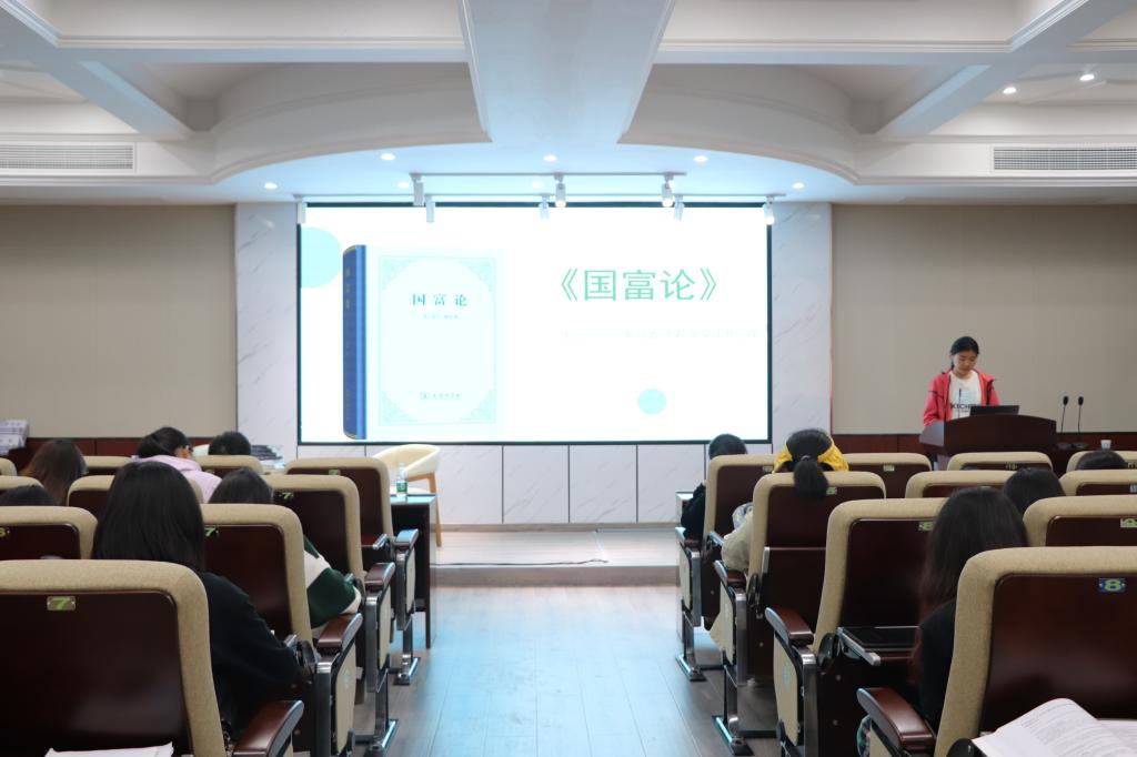 接着,陈洁老师与大家分享了《区际经济与国际贸易》读书心得,她围绕作品起源、主要内容、重要思想和产生影响等方面一一进行阐述,向大家介绍该书共分为五部分,具有较强的逻辑性,涵盖了国贸专业的相关理论知识,同时还与宏观经济学、微观经济学、政治经济学等学科相联系。她指出该书不仅在国际经济与贸易专业中具有较高的地位,而且在其他经济学教科书中具有重要的影响力,如国际贸易中的HO定理便是源自于此书。最后,陈老师还与同学们共享了该书的第50页经典片段,带领大家走近经典。