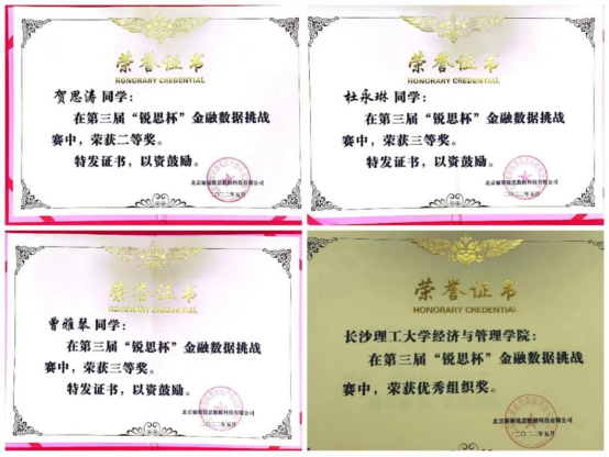 第三届锐思金融数据挑战赛于2022年3月31日正式启动,于5月中旬落下帷幕。本次比赛由永利集团88304官网经济与管理学院金融系和湖南省产教融合研究生联合培养基地“投资与财富管理研究生培养基地”联合组织。我院金融专业硕士贺思涛获二等奖,曾雅琴、杜永琳获三等奖,许苇坤获优秀参与奖,会计专业硕士钟婷婷获优秀参与奖。