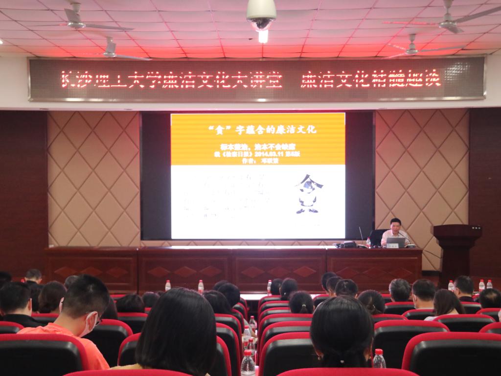 讲座中,邓联荣以文化为切入点,围绕习近平总书记在湖南考察的足迹,强调了中华传统文化传承和新文化业态发展的重要性,指出廉洁文化的在反贪防腐工作中的不可或缺性。邓联荣精辟解读了“腐”和“贪”二字,深入分析了廉洁文化的精髓所在,以生动的案例引发在座师生思考互动如何以透明保廉洁,让权力在阳光下运行。最后,引用毛主席的反腐败语录“共产党员在政府工作中,应该是十分廉洁、不用私人、多做工作、少取报酬的模范”警戒大家要用积极阳光的心态去面对生活,共创清廉校园。