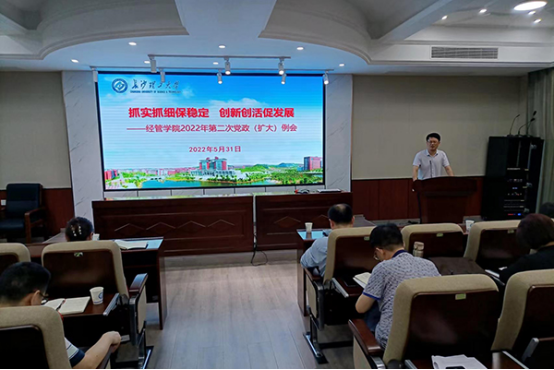 5月31日下午,经管学院围绕“抓实抓细保稳定,创新创活促发展”主题,在D207会议室召开了第二次党政(扩大)例会,全体院领导、系室正副主任、支部正副书记、支委成员、辅导员、教学督导组组长参加了会议。会议由学院党委书记丁丹主持。
