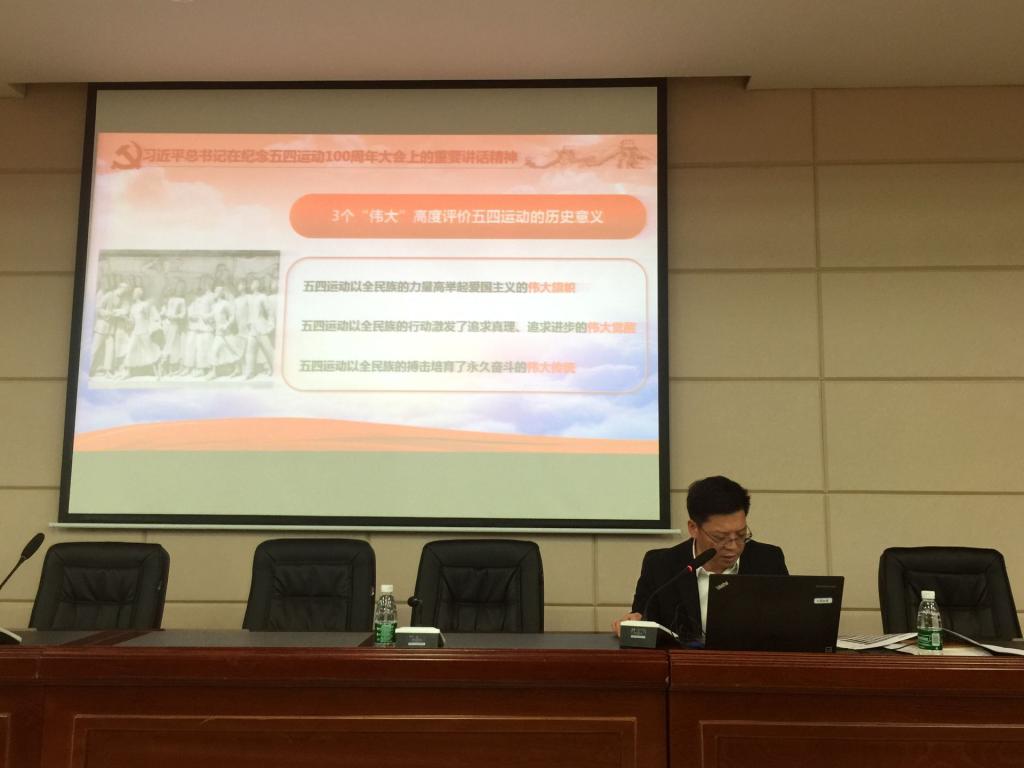 5月7日下午在文科楼A200,院党委书记王宏以“发扬伟大五四精神,培育一流素质人才”为主题,用PPT带领学院全体教职工共同学习了“习近平总书记在纪念五四运动100周年大会上的重要讲话精神”。