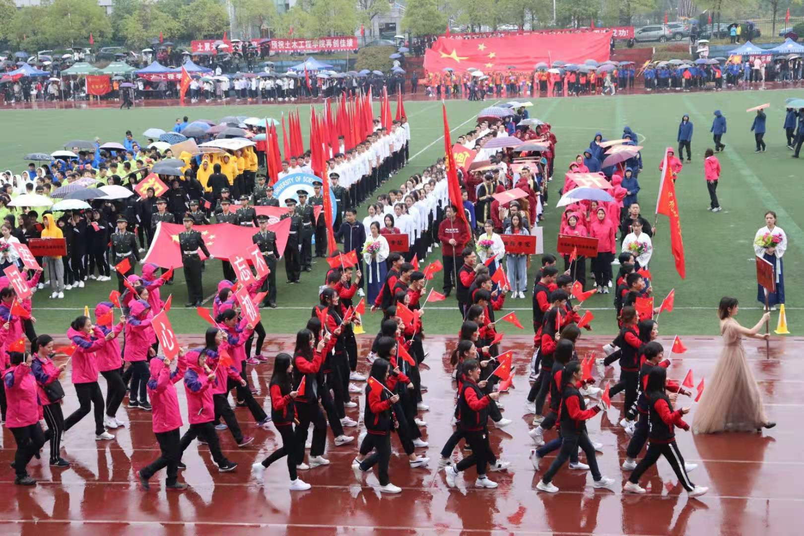 虽然天公不作美,但丝毫并未影响学院师生的士气,大家身着统一服装,手持国旗,齐声高喊着“不忘初心、牢记使命!立德树人,教育为民!”的嘹亮口号整齐列队经过主席台,让全校师生展示了学院老师和同学们良好的精神风貌。