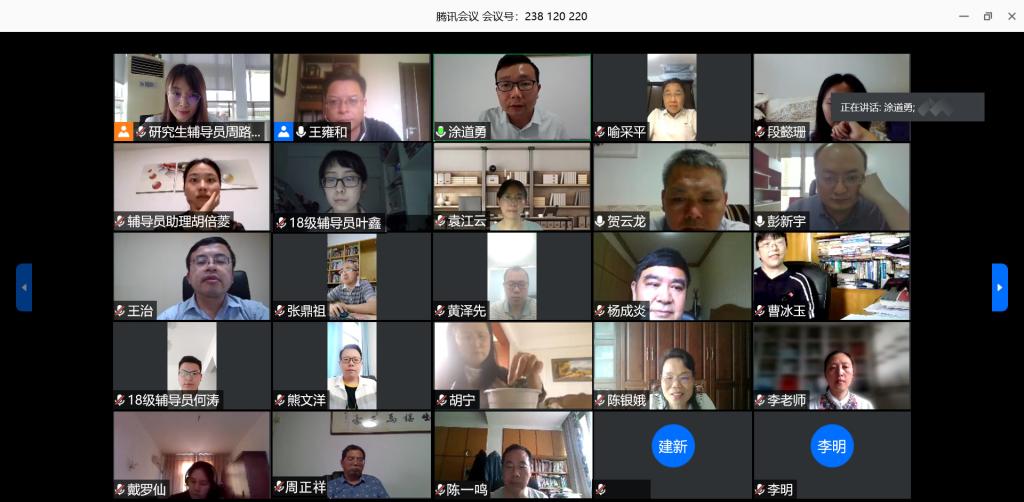 接着,党委副书记涂道勇从工作的总基调、总体思路和基本程序等方面详细解读了《经管学院关于研究生返校及封闭式管理的通知》内容,希望全体研究生导师肩负起研究生教育管理第一责任人的重任,做好研究生返校前、返校中、返校后的教育与管理。接着他还向导师们通报了目前2020届研究生毕业生的就业情况,希望导师们主动关心未就业研究生的现状,与研究生辅导员一起对未就业学生实行“一人一策”,并做好“五个一”(即开展“一次谈心谈话”,进行“一次简历指导”,开展“一次家校沟通”,重点推荐“一个就业岗位”,每周汇总一次推进情况),确保2020届毕业生顺利毕业,并走向满意的工作岗位。