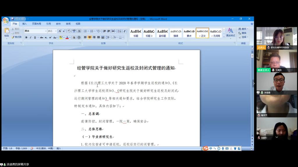 2020年5月16日下午3:30,经管学院召开2020年春季学期研究生返校工作暨研究生导师网络视频会议,全体院领导、全院研究生导师、研究生办和学工办全体成员参加了本次会议,会议由院党委书记王宏主持。