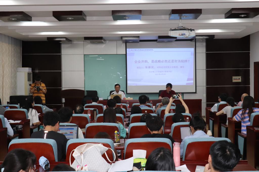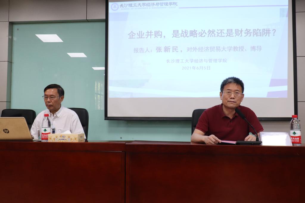 2021年6月5日下午2点,经管学院有幸邀请到对外经济贸易大学副校长张新民教授,于金盆岭校区七教212开展了题为“企业并购,是战略必然还是财务陷阱?”的学术讲座。本次讲座还特别邀请到了湖南师范大学原副校长王善平教授,经管学院部分领导老师及研究生、本科生参加。讲座由永利官网副校长叶泽教授主持。