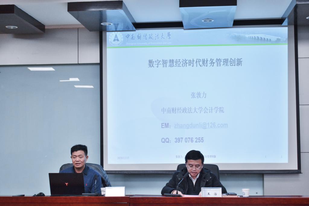 2020年12月15日上午9:00,中南财经政法大学会计学院院长张敦力教授应邀于金盆岭校区7号教学楼212室,为我院师生开展了以“数字智慧经济时代财务管理创新”为主题的学术讲座。本次讲座由经管学院副院长王治教授主持,学院部分老师以及会计、金融专业80多名硕士研究生参会。