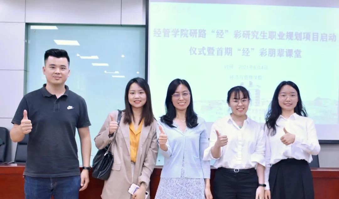 为更好引导研究生做好职业规划,发挥研究生朋辈教育力量,2021年6月4日下午14:30,经济与管理学院于金盆岭校区七教212举办了研路“经”彩研究生职业规划项目启动仪式暨首期“经”彩朋辈课堂。