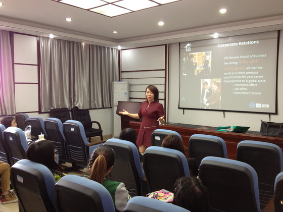 冯女士首先作了简短的自我介绍,讲述了她13年来在法国求学、工作和生活的经历,与大家分享了一些个人的学习经验,接下来她向同学们介绍了法国的教育理念和高等教育制度,最后,她向大家重点介绍了以雷恩高等商务学院(英国《金融时报》2014年度管理硕士排名第23位,比2013年上升13位)为代表的几所高商的硕士招生制度、条件,学生成功申请后到法国学习能享受到的福利待遇,以及学成之后进入职场的优势所在。在场的学生对所讲的内容很感兴趣,听得很认真,提出了相应的问题,冯女士和她的助理也一一给出了详细的解答。