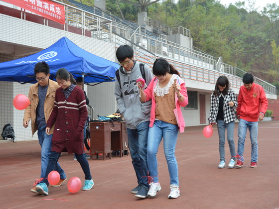 首先进行的是“情侣”趣味小活动。在“心有灵犀”这个环节中,一男一女为一组,一个做动作一个猜成语,各组不乏稀奇古怪的动作,让人忍俊不禁。随后的“情歌接龙”环节,在歌声的带动下,现场充满了笑声。接下来是此次活动的高潮:“背对背拥抱”环节。男生和女生背对背站立,手互相拉着,两人背中间夹着一个气球看哪一组先跑到终点。这个环节十分考验男女生之间的配合,两个学院的同学们很快打成一片。“情同手足”的环节中,男女生自由组合,将两人相邻的两只脚绑在一起,看哪一组先跑到终点。其中一组大二的男女生配合得很完美,赢得了比赛。田径场的活动完成之后,同学们来到了云影湖畔漫步,交流学习心得,互赠自己最喜爱的励志名言。最后,男生们还邀请女生共进晚餐,畅谈人生理想,互相勉励、共同进步。
