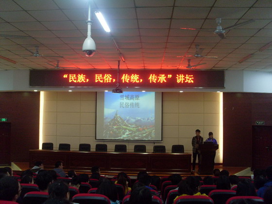 12月2日下午16:30,经管学院在文科楼A200举办“民族、民俗、传统、传承”讲坛第一讲。本次讲坛由经管学院2013级藏族学生格桑卓嘎和普布次仁主讲,主题为“走近西藏”。学工办计潇作为嘉宾应邀出席,近200名学生聆听了本次讲坛。