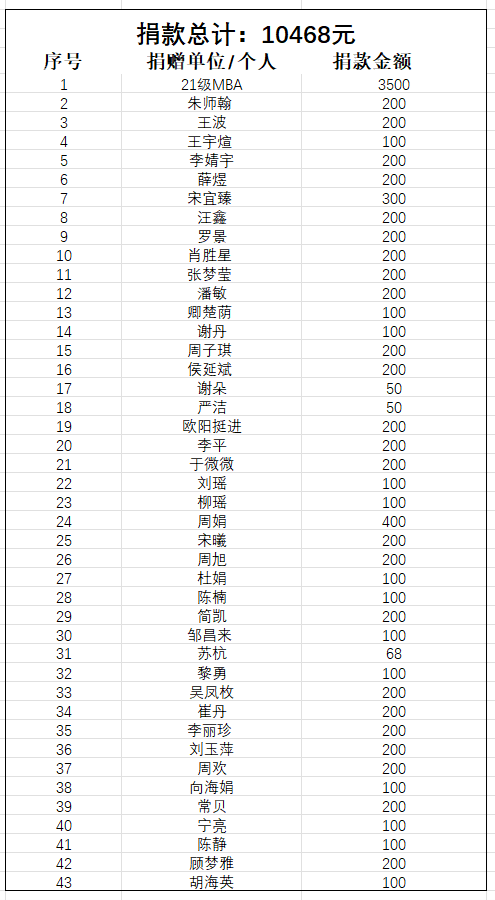 得知此事后,在校MBA学员立即纷纷提议捐款,想为向丹同学带去温暖与帮助。于是 21级和22级MBA两个班委会在微信群发起爱心捐款的倡议,大家积极响应,踊跃捐款。