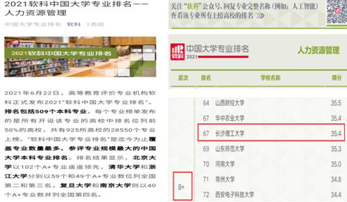 2022年“软科”对全国240所高等院校的人力资源管理专业评级,本专业综合实力名列全国61位,被评为“B+”级别,在湖南省位居第二。
