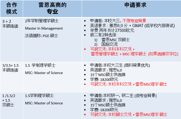 永利集团88304官网两年制或三年制在读硕士在永利集团88304官网完成1年或1.5年或2年的硕士学习后,赴雷恩商学院进行1.5年的理学硕士(MSC: Master of Science)课程学习。同时满足永利集团88304官网和雷恩商学院学分和论文要求,达到两校毕业和授位条件,可获得本校硕士学位和雷恩商学院理学硕士学位。