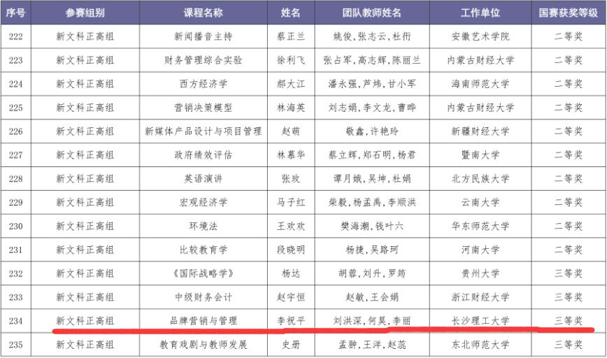 本届大赛由教育部教育部高等教育司指导、中国高等教育学会主办,以“推动教学创新,培养一流人才”为主题,旨在深入贯彻党的二十大精神,学习贯彻习近平总书记关于教育的重要论述,落实立德树人根本任务,助力课程思政建设和新工科、新医科、新农科、新文科建设,推动信息技术与高等教育教学融合创新发展,引导高校教师潜心教书育人,打造高校教学改革的风向标。大赛采用校赛、省赛、全国赛三级赛制,于2022年10月启动,按照“四新”建设、基础课程、课程思政等领域和参赛教师专业技术职务等级分组,设6个大组,每组下设正高、副高、中级及以下3个组,共计18个小组。全国32个赛区共1194所普通本科高校83224名教师参加校赛,23088名教师参加省赛,1701名教师(含团队成员)参加全国赛,其中有239门课程的898位教师入围全国赛现场评审。经过层层筛选,最终评选出一等奖72项、二等奖166项、三等奖227项。其中新文科正高组一等奖7项,二等奖17项,三等奖24项。