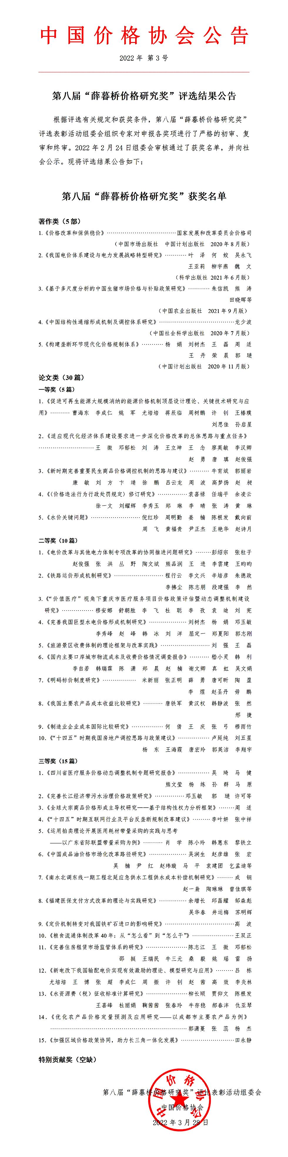 3月28日,中国价格协会官网公告,第八届“薛暮桥价格研究奖”评选表彰活动组委会审核通过了获奖名单,永利集团88304官网经济与管理学院叶泽教授团队(叶泽、何姣、吴永飞、王亚莉、柳宇燕、魏文)著作《我国电价体系建设与电力发展战略转型研究》荣获第八届薛暮桥价格研究奖,实现了我院在该奖项领域零的突破。