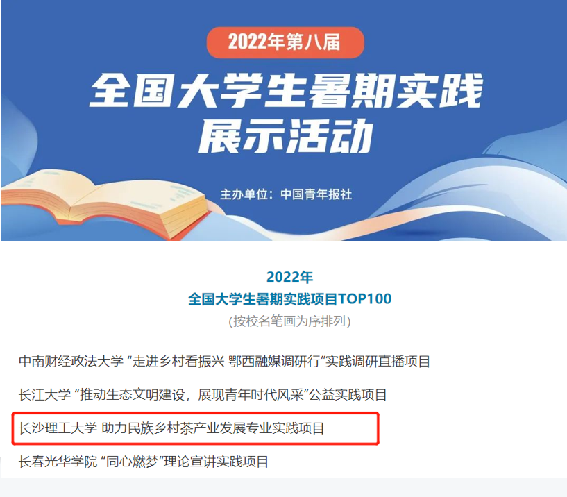 近日,2022年第八届全国大学生暑期实践展示活动名单公布,永利集团88304官网经管学院“助力民族乡村茶产业发展专业实践项目”荣获2022年第八届全国大学生暑期实践TOP100。该项目是由经管学院敖洁教授指导,由21级公共管理班王梦晗、张晗、刘雅杰、王秀梅、刘敏、21级经济班石璐青等6名研究生组成的暑期社会实践团队完成。
