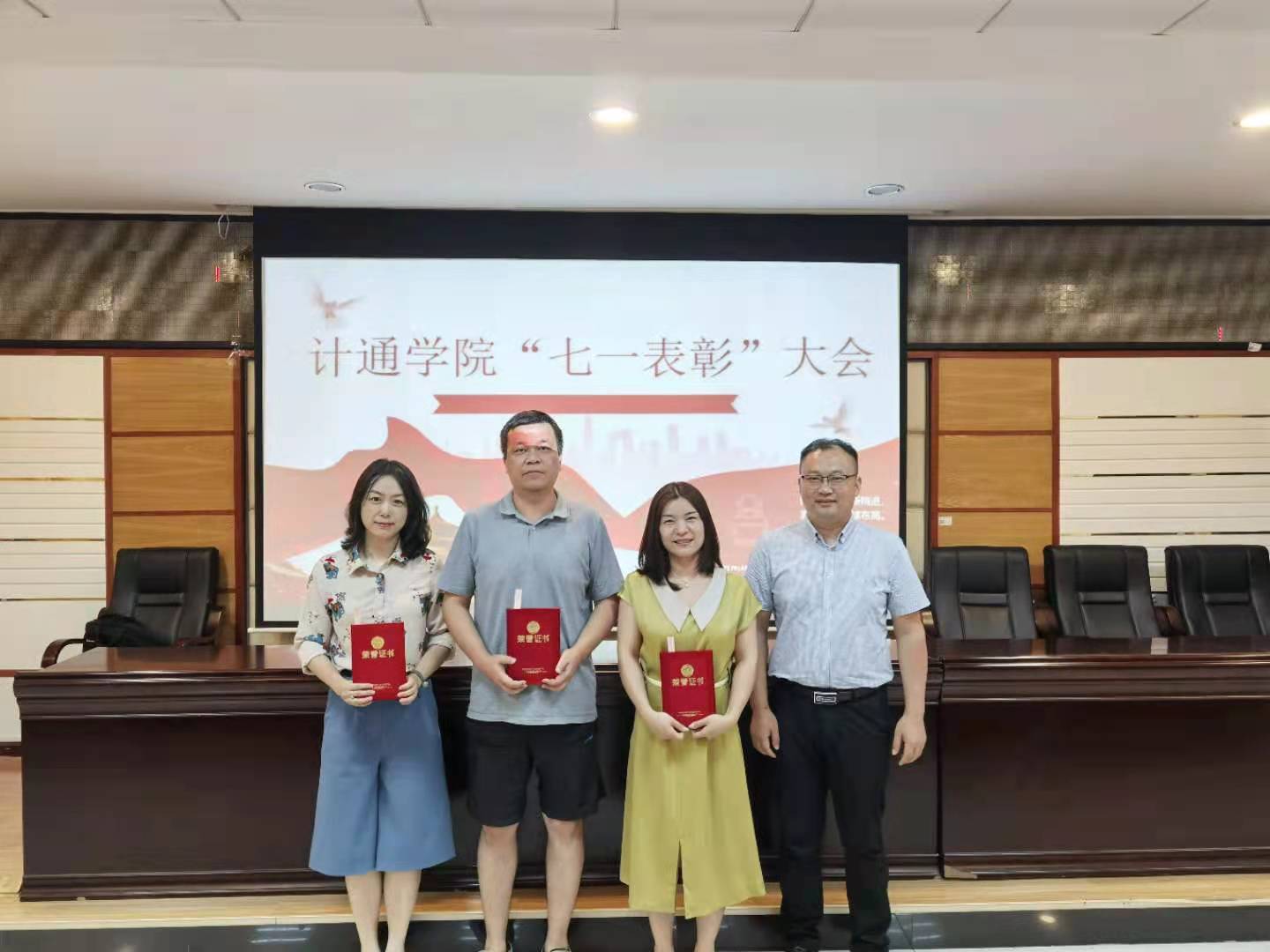 7月4日下午,计通学院“七一”表彰大会在理科楼B311举行,学院全体教职工参会,会议由院党委书记孔伟红主持。